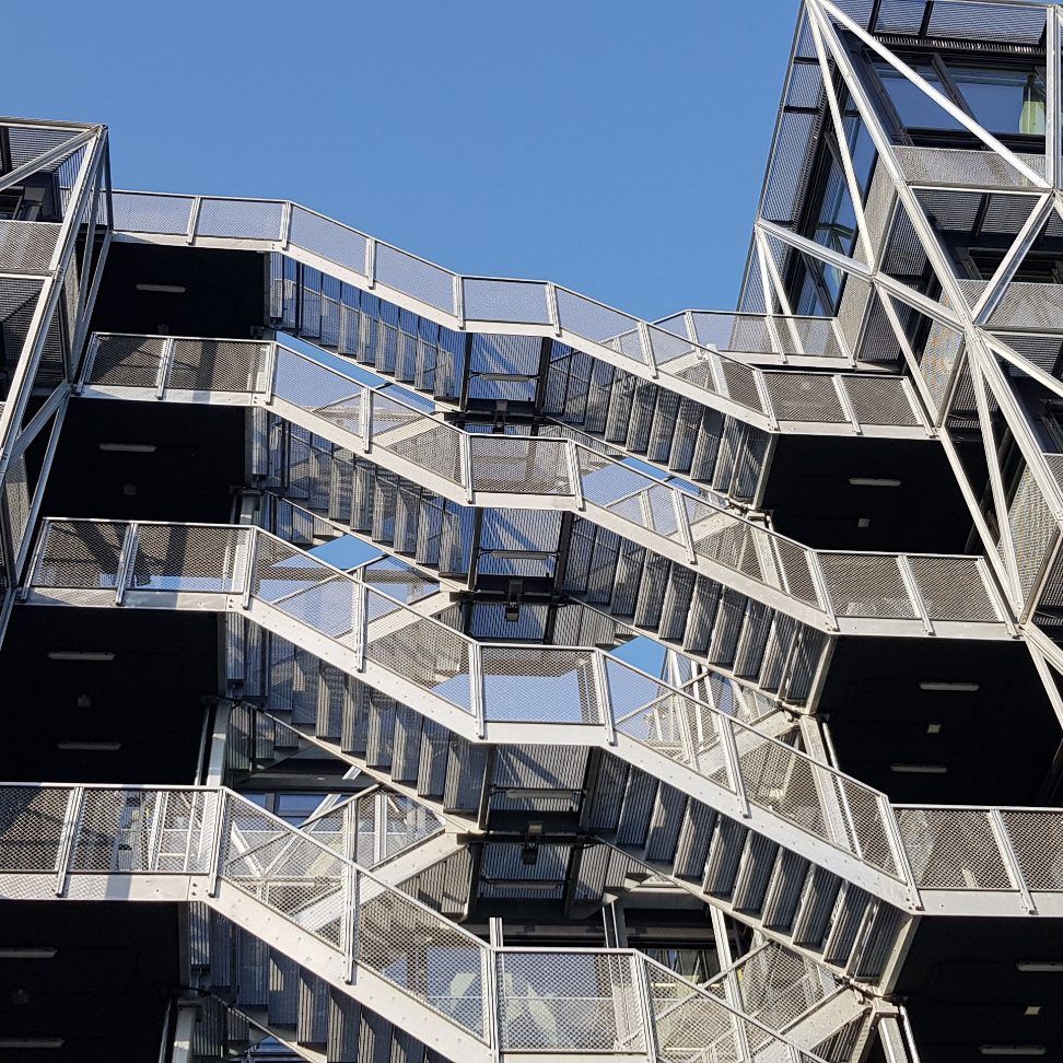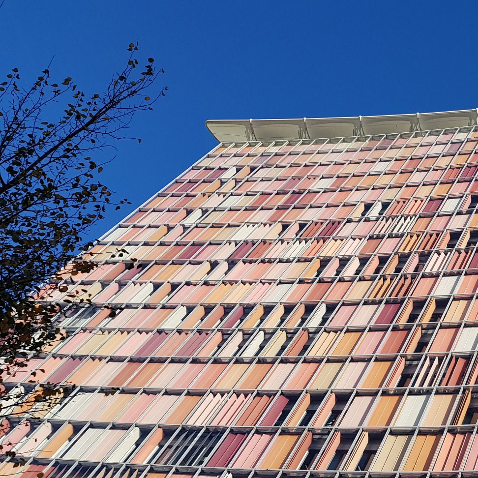 charakteristischen Fassadenkonstruktion in das umliegende,